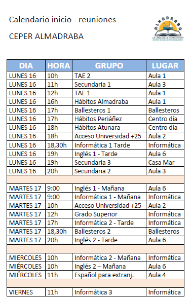 La semana que viene iniciamos curso y lo hacemos con la reunión inicial que sirve de presentación y comienzo. Este es el calendario de reuniones definitivo. Está todo preparado para empezar, así que….. prepárense porque… ¡¡¡arrancamos!!! Puedes ver los horarios de clase en la pestaña HORARIOS